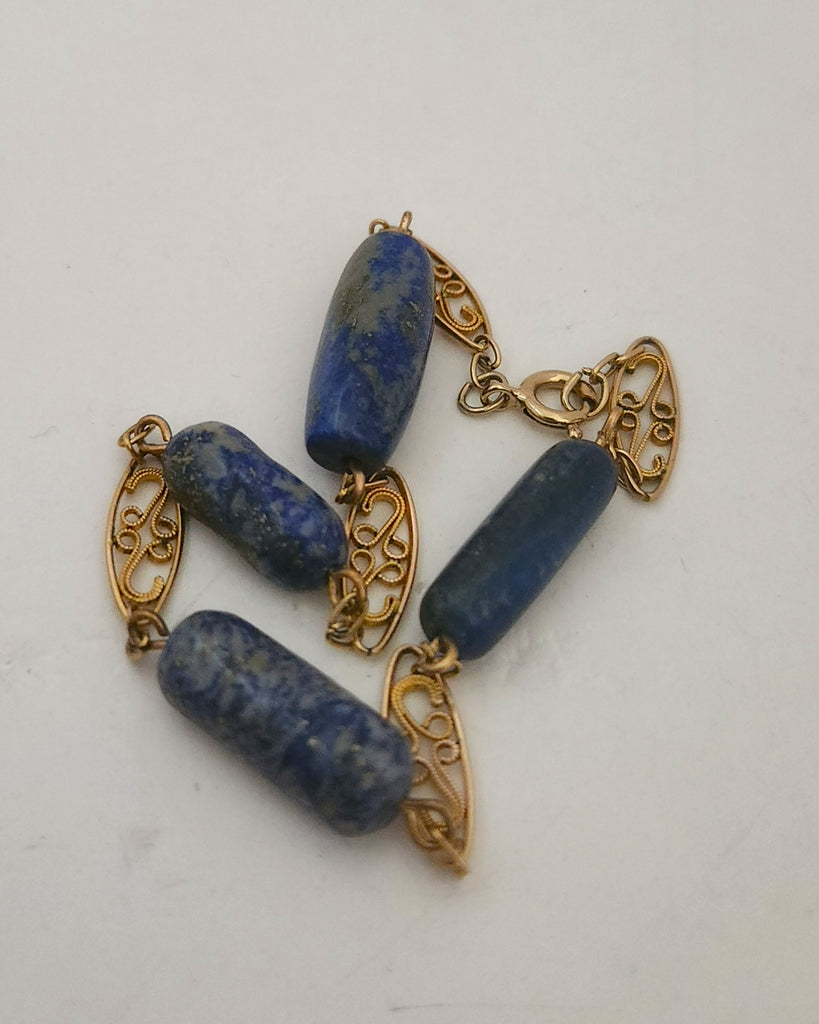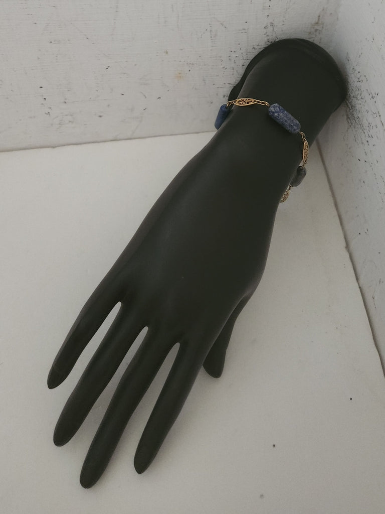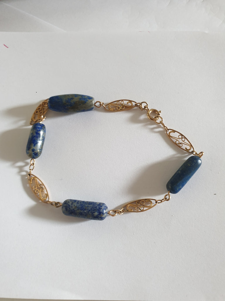 Bracelet réalisé à partir d'éléments filigranne de chaîne de montre vintage des années 30 en métal doré et de perles de lapis-lazuli. Fermoir neuf hypoallergénique.