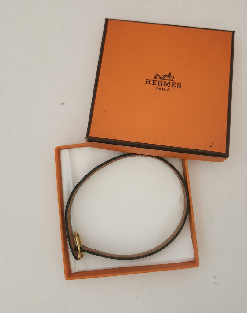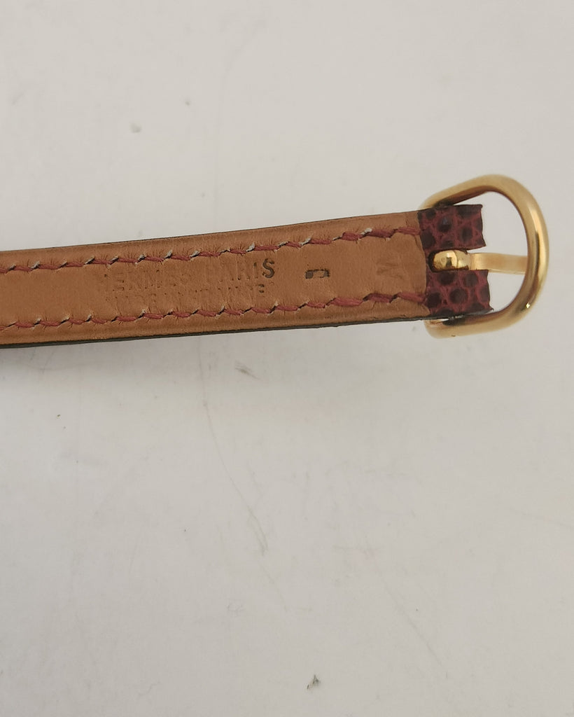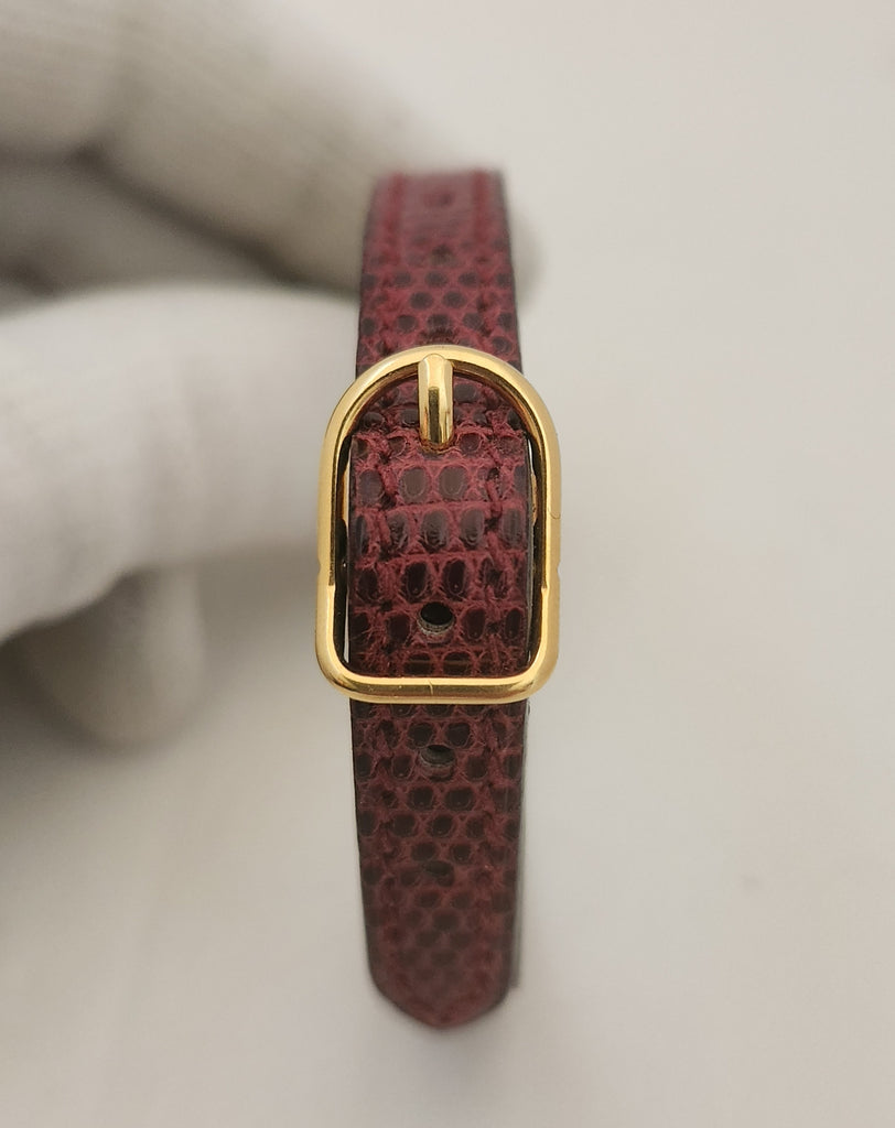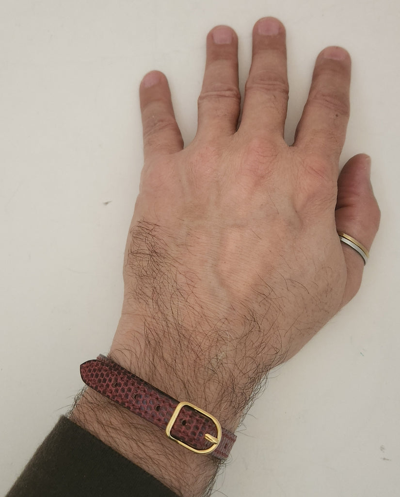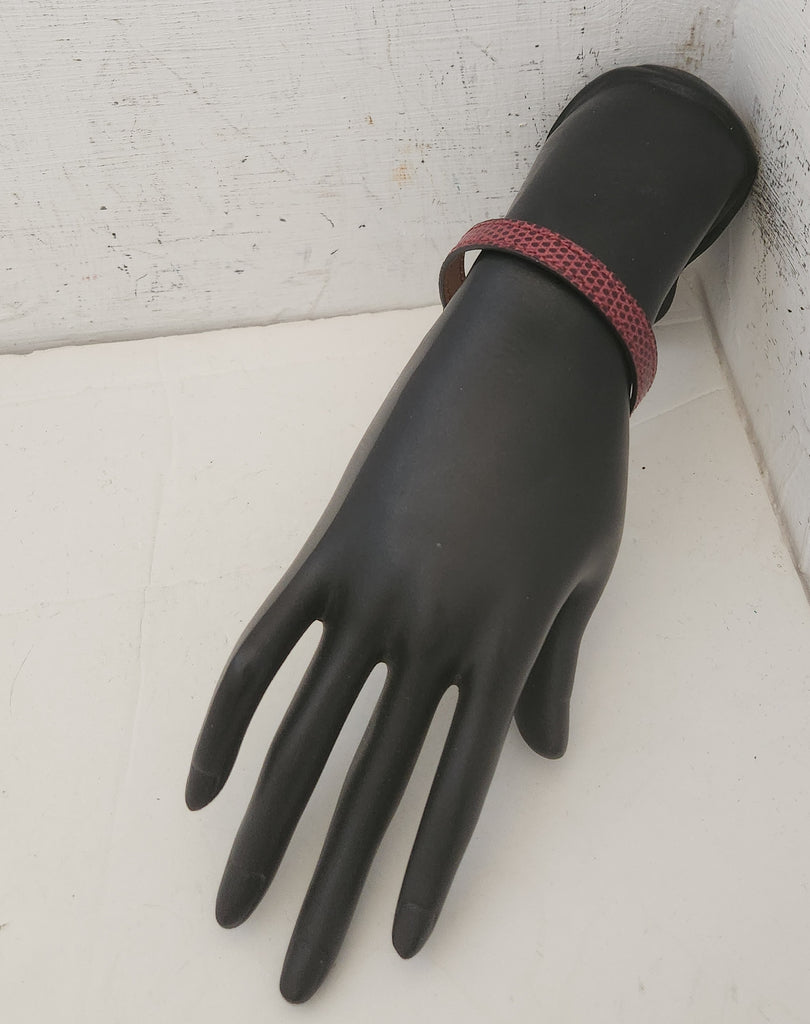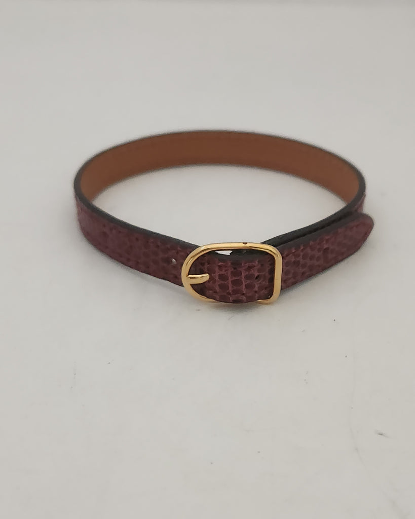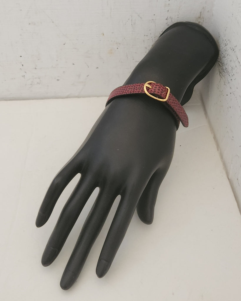 Bracelet en lézard violine à boucle étrier en métal doré.