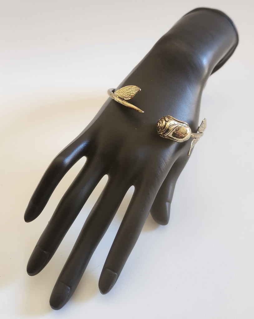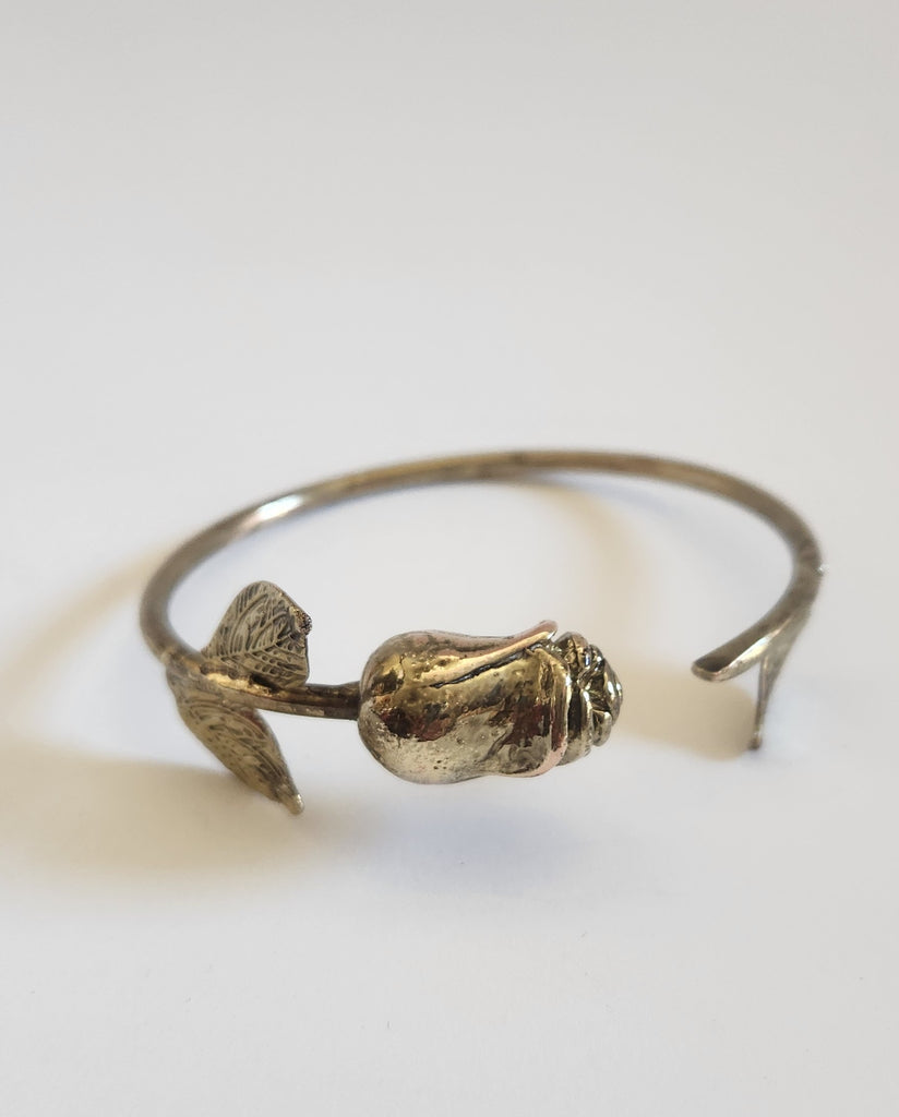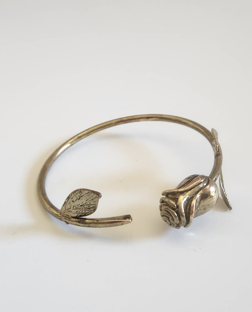Bracelet ouvert vintage en bronze terminé par un bouton de rose et orné de feuilles. Diamètre 6.6 cm
