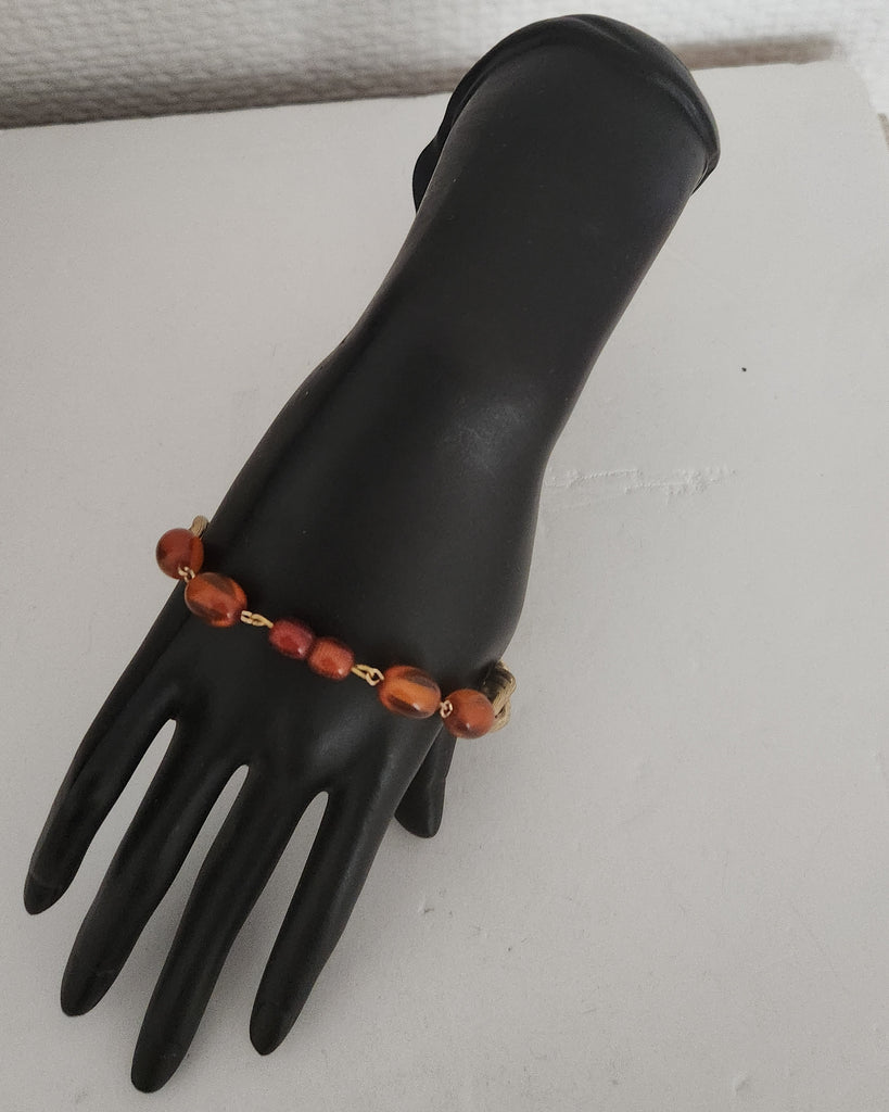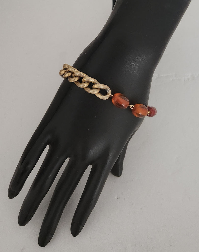 Bracelet de chaîne de métal doré maille gourmette striée et de perles de résine imitant l'ambre. Longueur 19 cm. Ce bijou est fait à la main à partir d'éléments vintage. Ses imperfections le rendent unique.