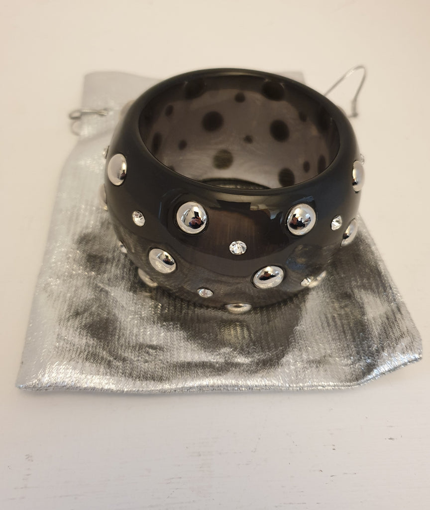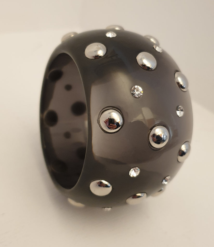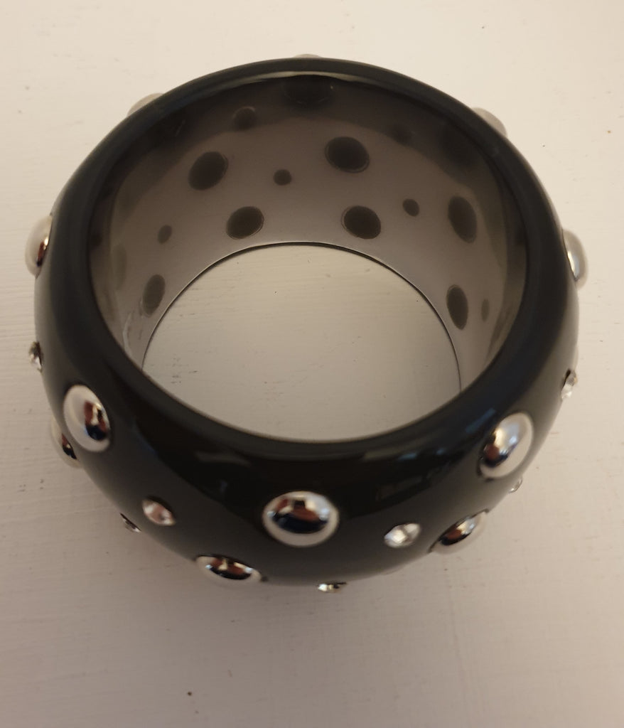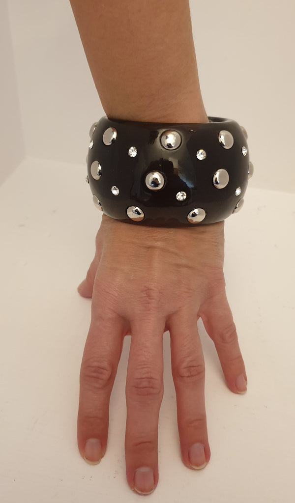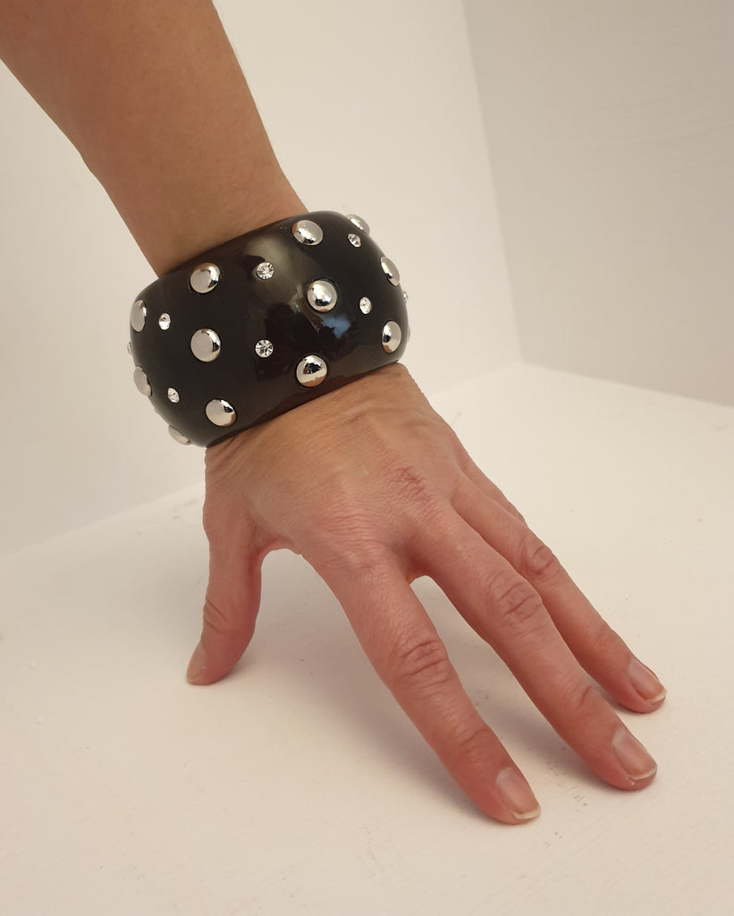 Bracelet manchette vintage des années 80 en résine noire serti de strass et de clous en métal argenté.