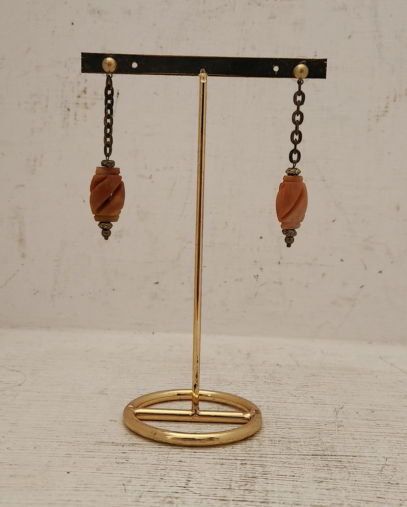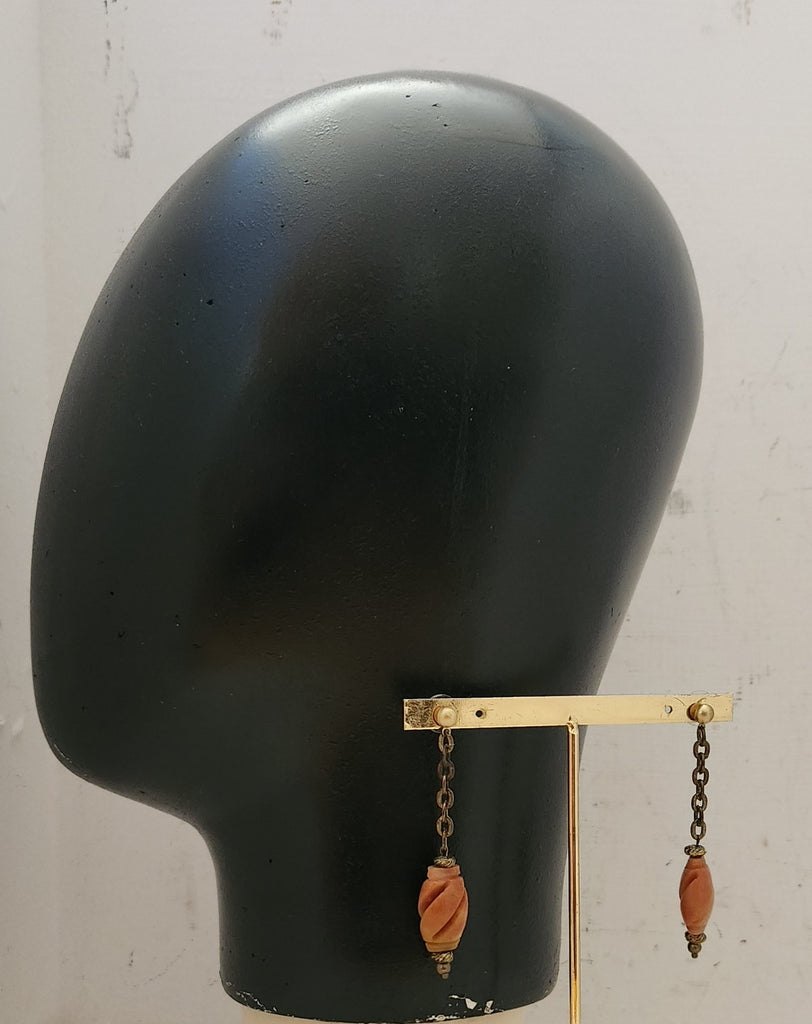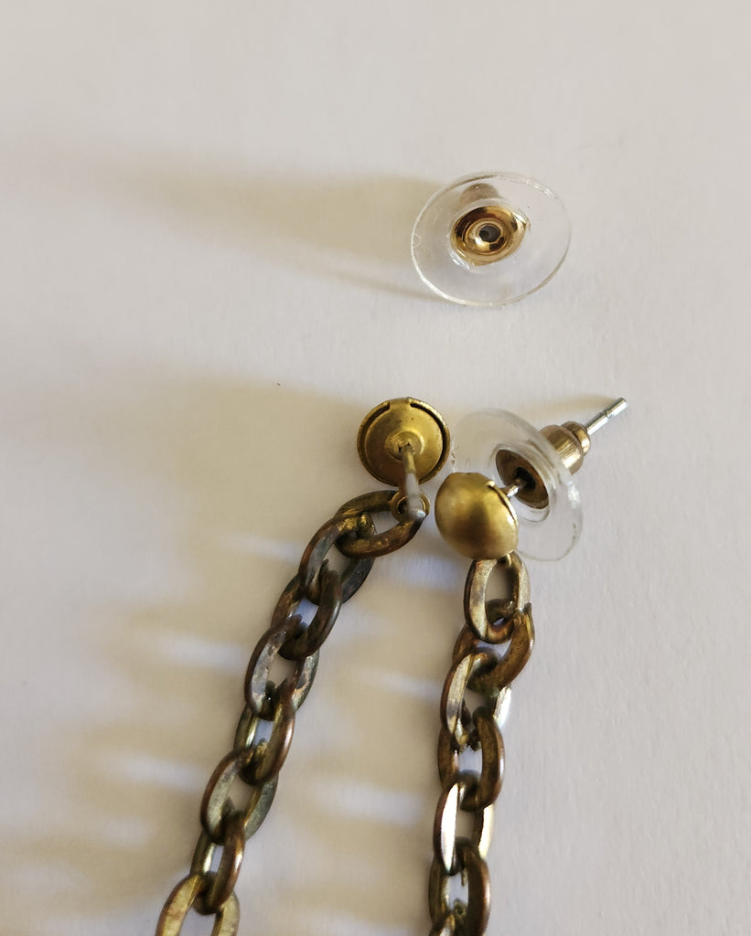 Boucles d'oreilles d'éléments d'agate travaillée et chaîne maille forçat plat en laiton. Longueur 7 cm. Attaches neuves en laiton hypoallergénique. Ce bijou est fait à la main à partir d'éléments vintage. Ses imperfections le rendent unique.