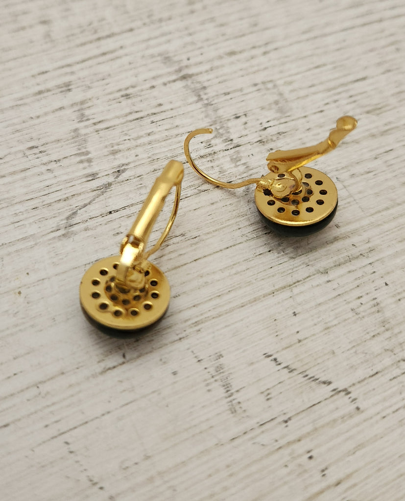 Dormeuses en métal plaqué or et demi-cabochons d'oeil de tigre. Attaches neuves hypoallergéniques. Longueur 2.2 cm. Ce bijou est fait à la main à partir d'éléments vintage. Ses imperfections le rendent unique.