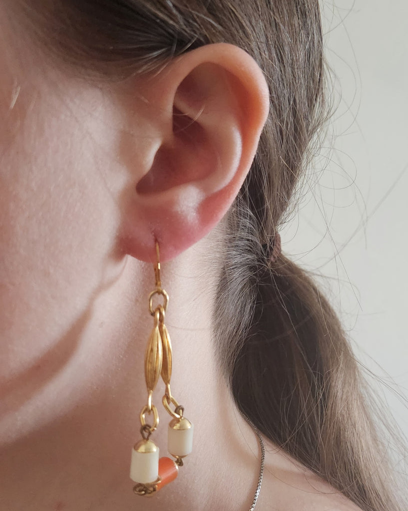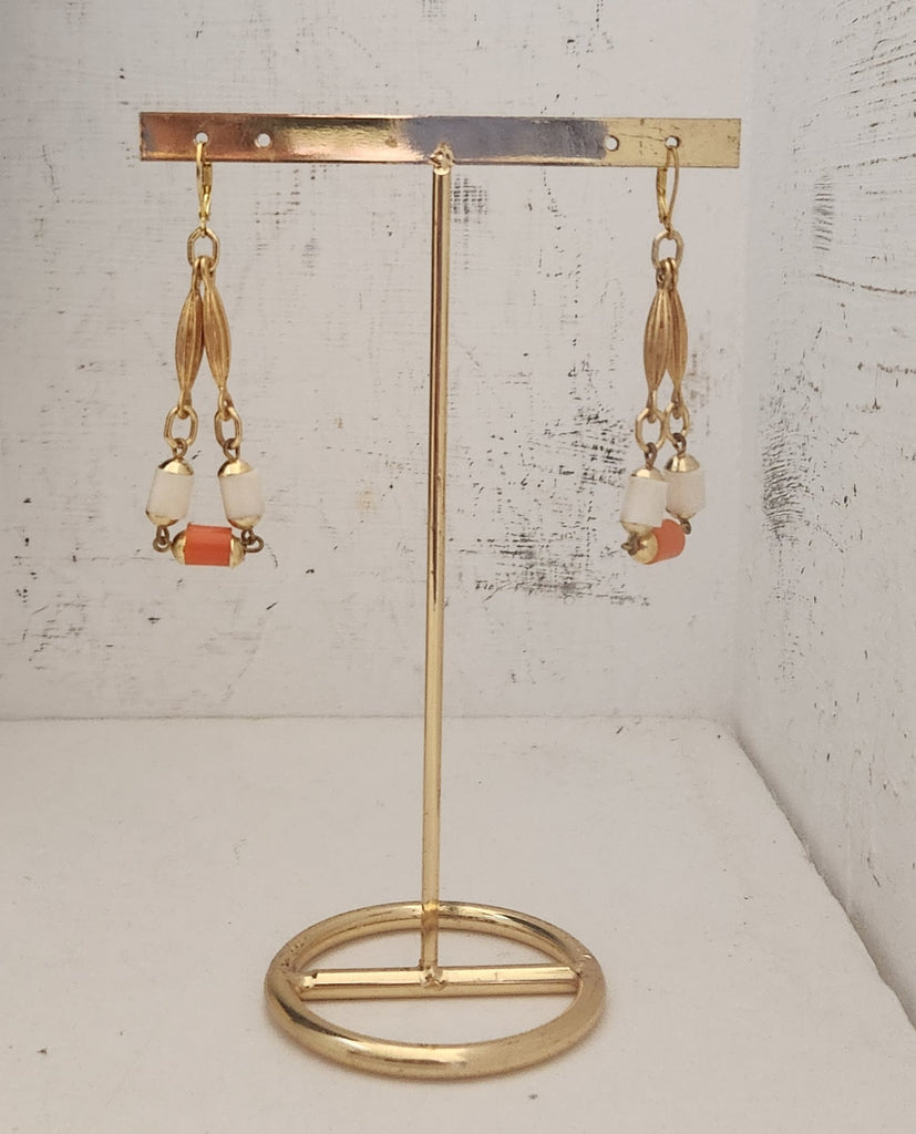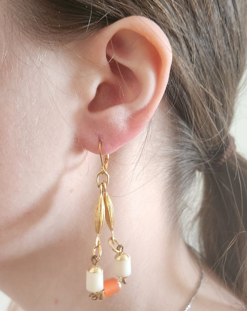Boucles d'oreilles upcyclées faites à partir de perles de résine  et d'éléments de métal doré vintages. Attaches neuves hypoallergéniques.