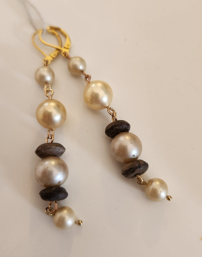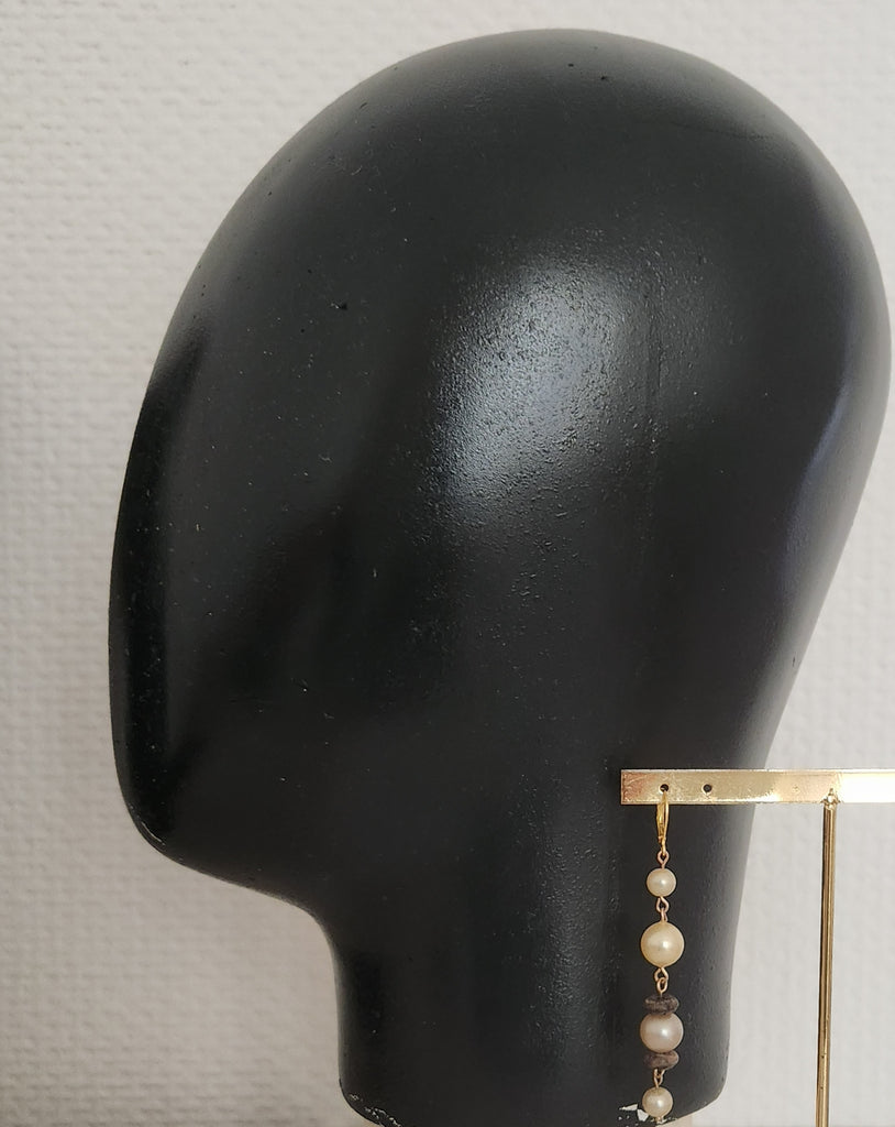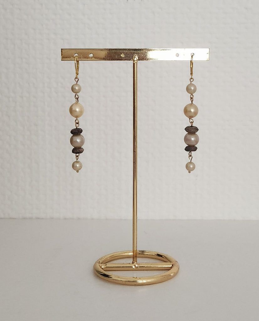 Boucles d'oreilles perles fantaisie couleur champagne et intercalaires de bois d'olivier. Attaches neuves hypoallergéniques. Longueur 8 cm. Ce bijou est fait à la main à partir d'éléments vintage. Ses imperfections le rendent unique.