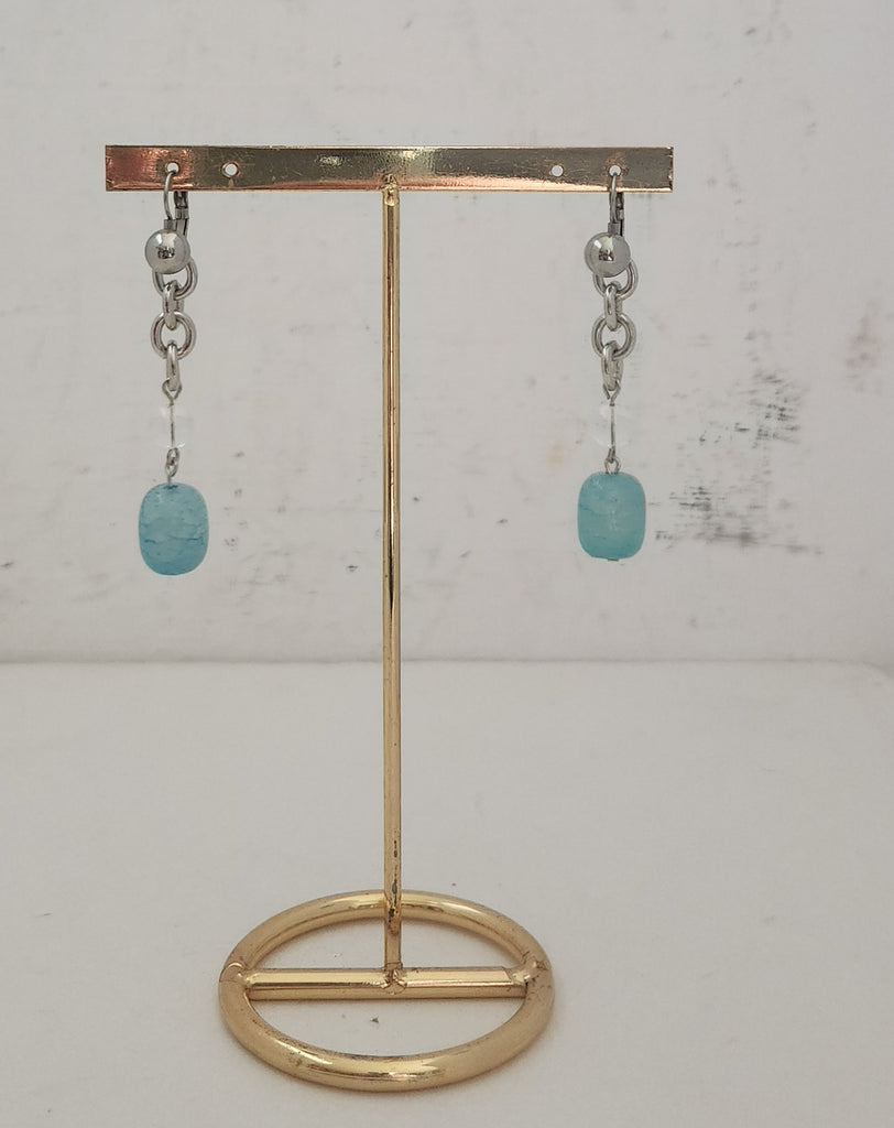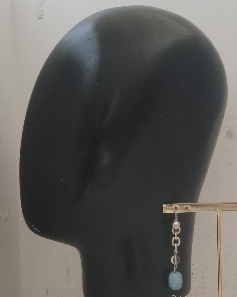 Boucles d'oreilles en chaîne de métal argenté maille forçat, agates couleur azur et perles de verre transparentes. Attaches neuves hypoallergéniques. Longueur 7 cm. Ce bijou est fait à la main à partir d'éléments vintage. Ses imperfections le rendent unique.