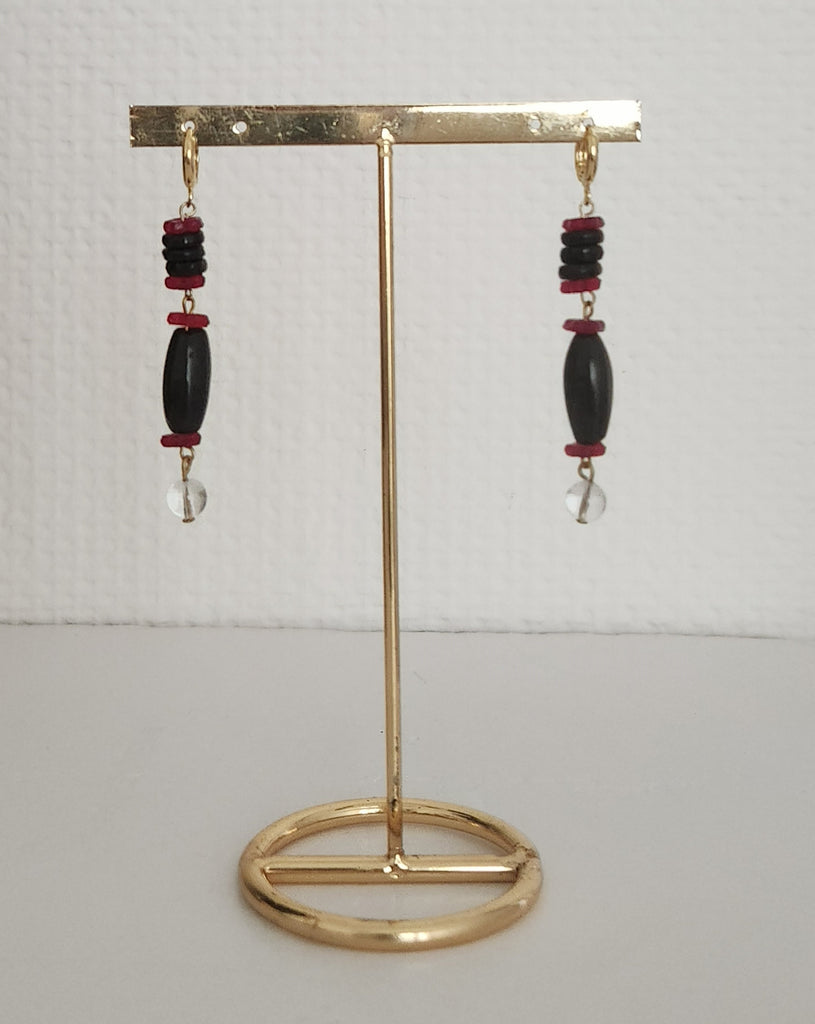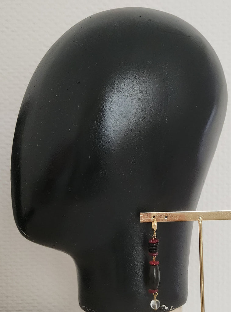 Boucles d'oreilles de perles facettées et rondes en résine et verre. Attaches neuves hypoallergéniques. Longueur 7.5 cm. Ce bijou est fait à la main à partir d'éléments vintage. Ses imperfections le rendent unique.