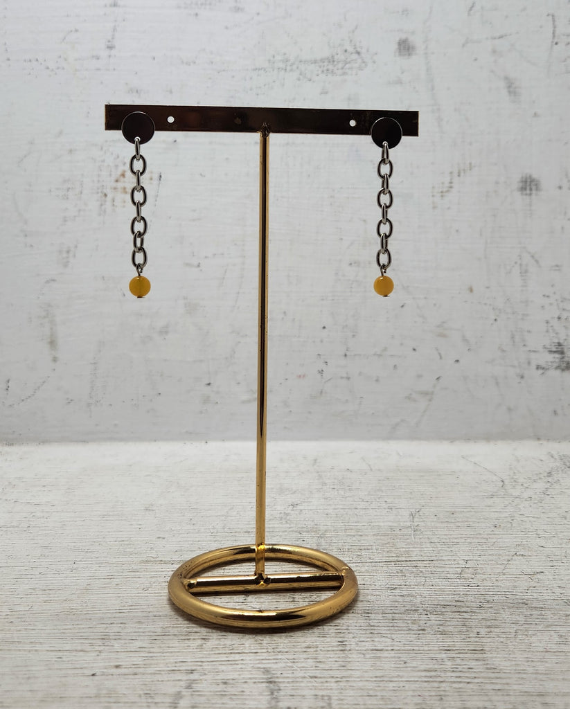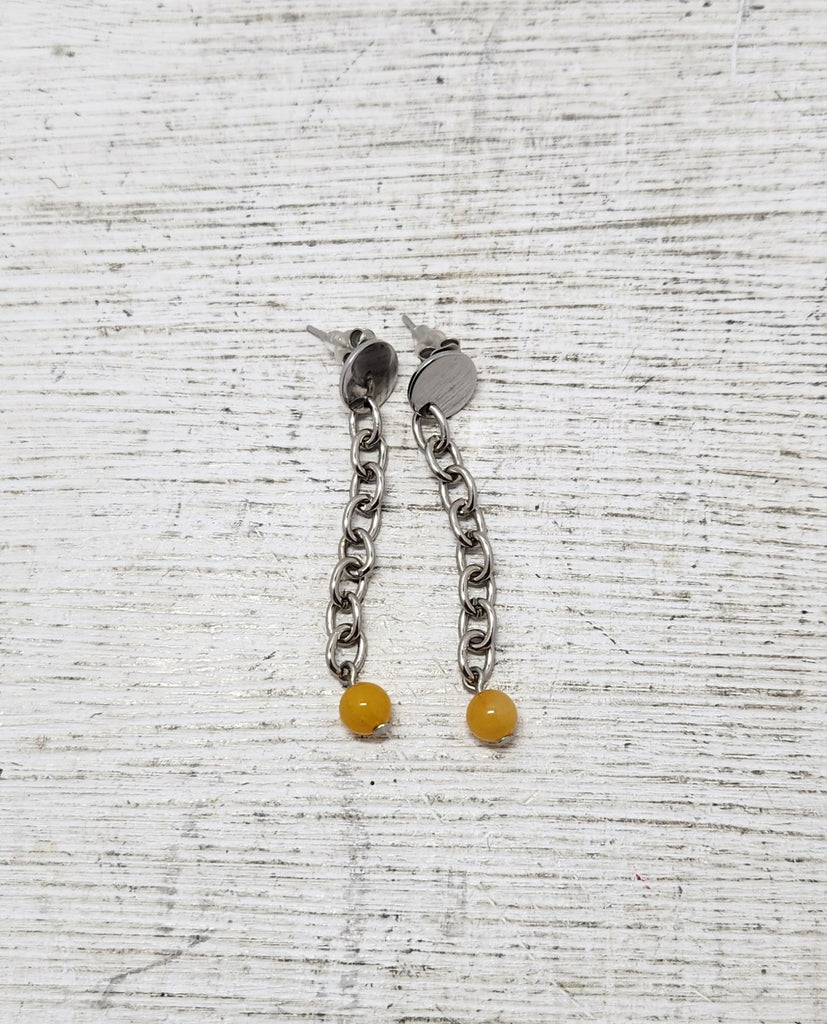 Boucles d'oreilles de perles de jade jaune et chaîne maille forçat. Attaches neuves en acier inoxydable. Longueur 5.5 cm. Ce bijou est fait à la main à partir d'éléments vintage. Ses imperfections le rendent unique.