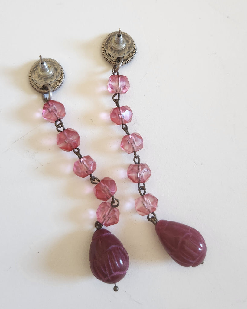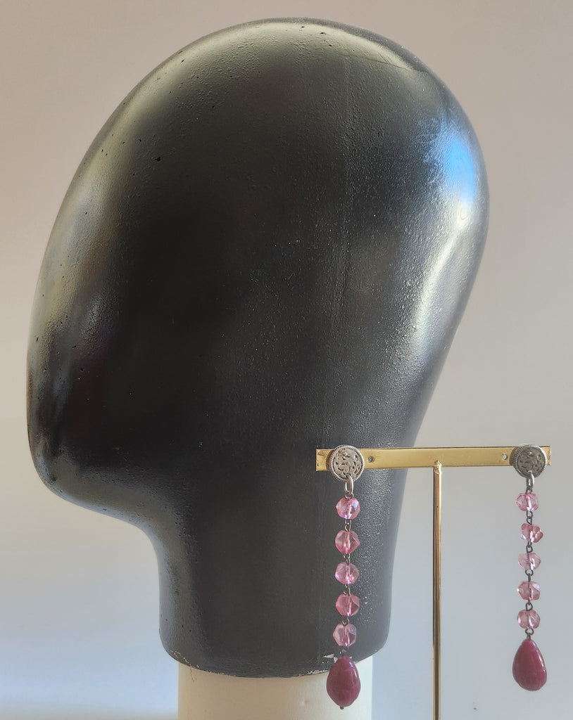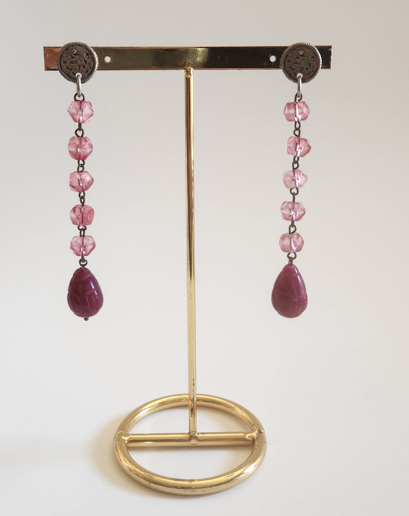 Boucles d'oreilles upcyclées avec perles de résine facettées associées à deux pendentifs en racine de rubis véritable. Attaches vintages. Longueur 9.5 cm. Ce bijou est fait à la main à partir d'un chapelet ancien et d'éléments vintage. Ses imperfections le rendent unique.