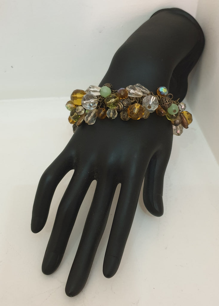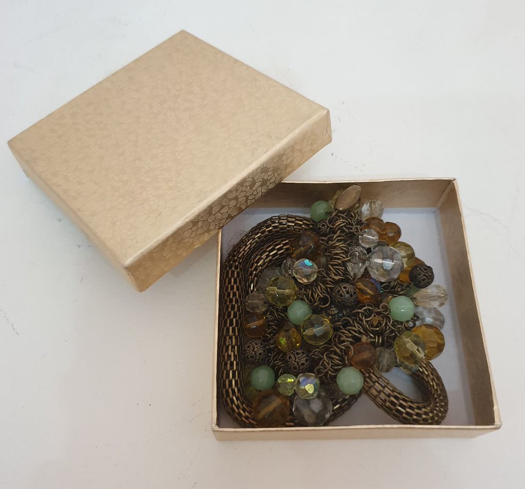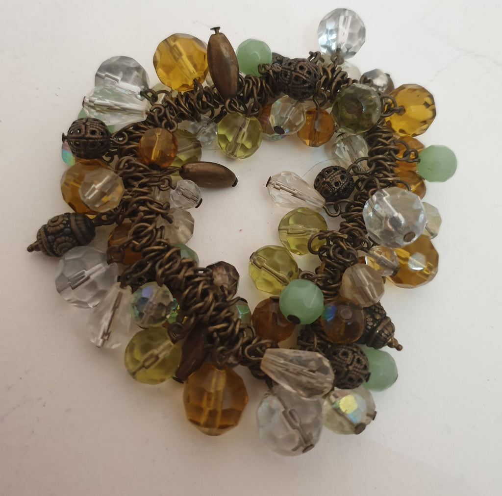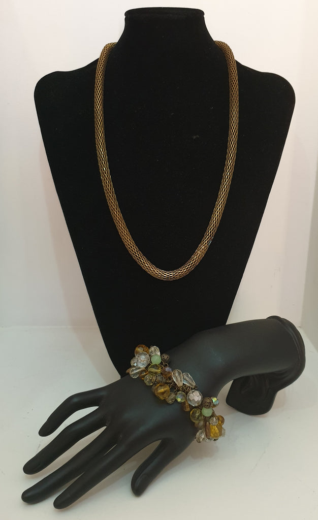 Vintage 80's set consisting of a tubular snake chain necklace and an elasticated bracelet in antique finish brass and faceted resin beads. Necklace 64 cm.