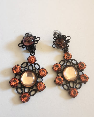Grandi orecchini a clip in stile lampadario in metallo annerito, cabochon e cristalli tagliati color rosa salmone di Jean-Louis Blin.