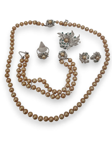 Parure di perle coltivate di Maiorca vintage degli anni '70, composta da una collana, un braccialetto a doppia fila, un anello, orecchini a clip e una spilla.